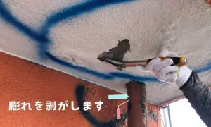 こちらの写真では、経年劣化して膨れを起こしてしまっている外壁部分を剥がしている様子です。専用の器具を使って膨れ部分を除去していきます。
